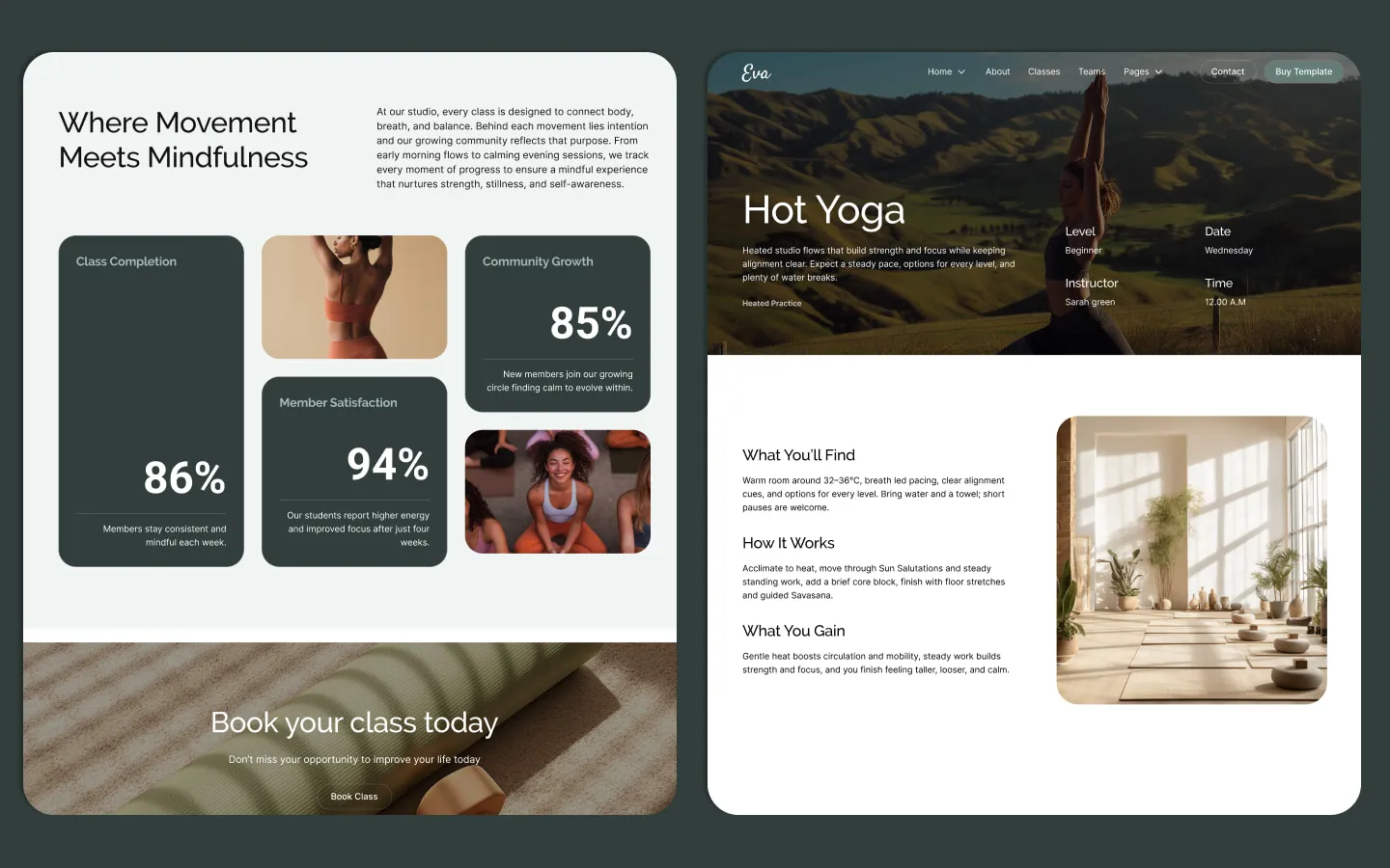 If you are exploring website templates for yoga, wellness, or fitness, Eva Studio provides a focused and professional foundation that adapts easily to your brand.