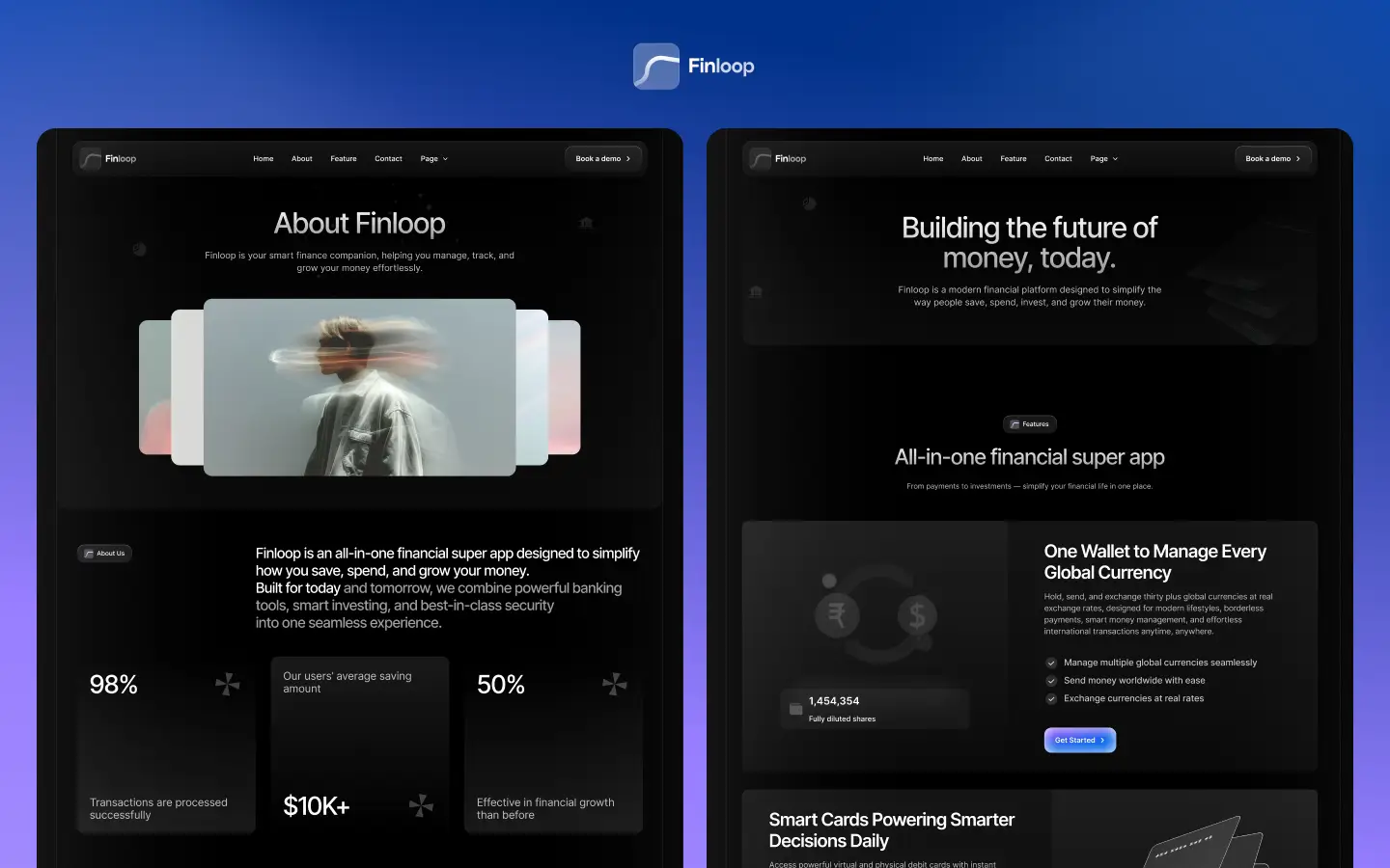 A sleek, transparent pricing section helps potential customers make decisions quickly. Whether it’s SaaS subscription plans or tiered fintech solutions, Finloop’s design keeps it simple and persuasive.