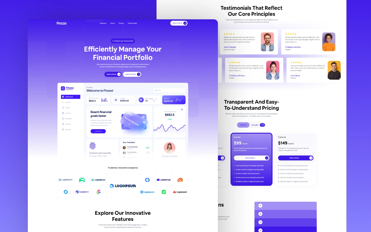 Finzzo is a clean and modern Webflow template designed for personal finance management, investment platforms, and fintech startups. It helps users efficiently manage their financial portfolios, gain full control over their finances, expand investments, and secure a stable financial future with confidence.