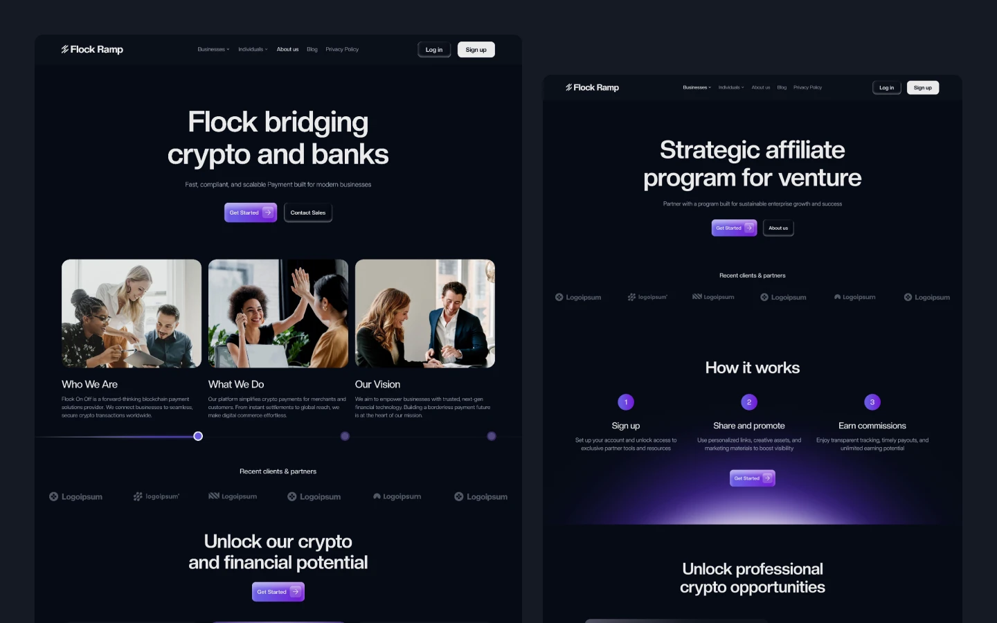 Flock Ramp is a modern Webflow template built for next-gen crypto on/off ramp platforms. With clean UI, fintech-grade sections, and conversion-focused layouts, it helps you showcase secure transactions, features, and compliance with clarity.
