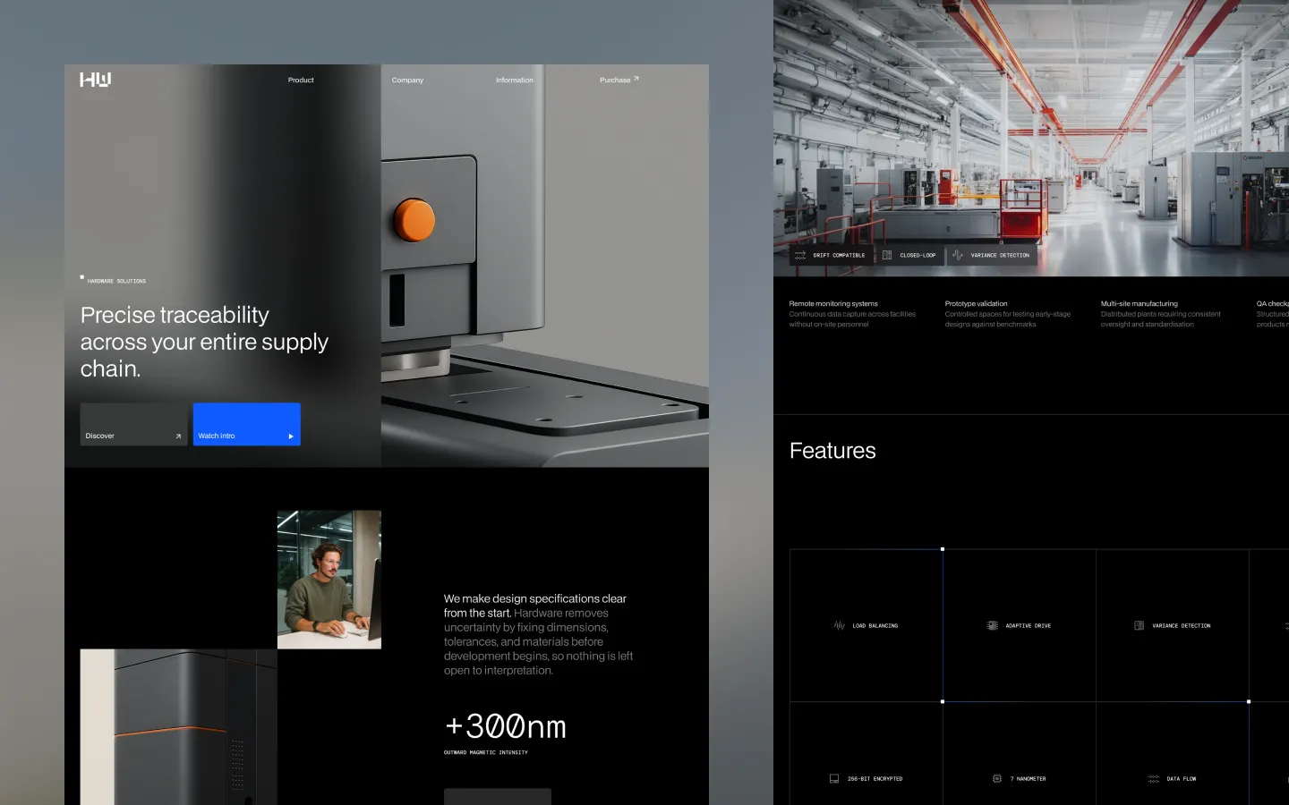 A deep black provides the backdrop throughout each page of Hardware’s design, evoking the template’s high-tech subject matter and bringing into sharp focus the bright white text content. This technical, monochrome aesthetic allows your images to take center stage and provides the perfect dark, moody atmosphere ideal for technology consulting, mechanical engineering, manufacturing, robotics, and even SaaS infrastructure businesses. A single brand colour in the Webflow variables panel makes it a breeze to inject color accents on all pages, so it's easy to align Hardware with your brand’s colour story. This is a premium Webflow template for engineering consulting firms, technology startups, research labs, and academic institutions seeking a polished look that adapts seamlessly to all types of technical content.