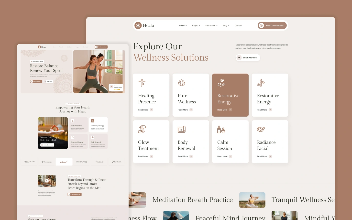 Reliora is designed for yoga studios, wellness centers, meditation spaces, and holistic practitioners who want a website that feels as peaceful as their practice. The layout is clean, airy, and thoughtfully spaced to create a calm browsing experience from the very first scroll.