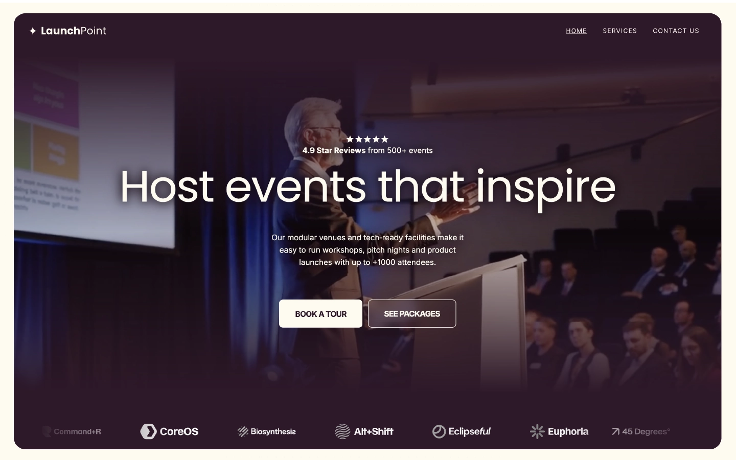 LaunchPoint Venues is a modern Webflow template built for corporate and startup event spaces that aim to drive engagement and business growth. Designed for pitch events, workshops, product launches, and networking sessions, it helps you present your venue with clarity and professionalism. Highlight flexible packages, amenities, and past events to position your space as the go-to choice for companies seeking to host events that inspire collaboration, attract clients, and strengthen brand visibility.