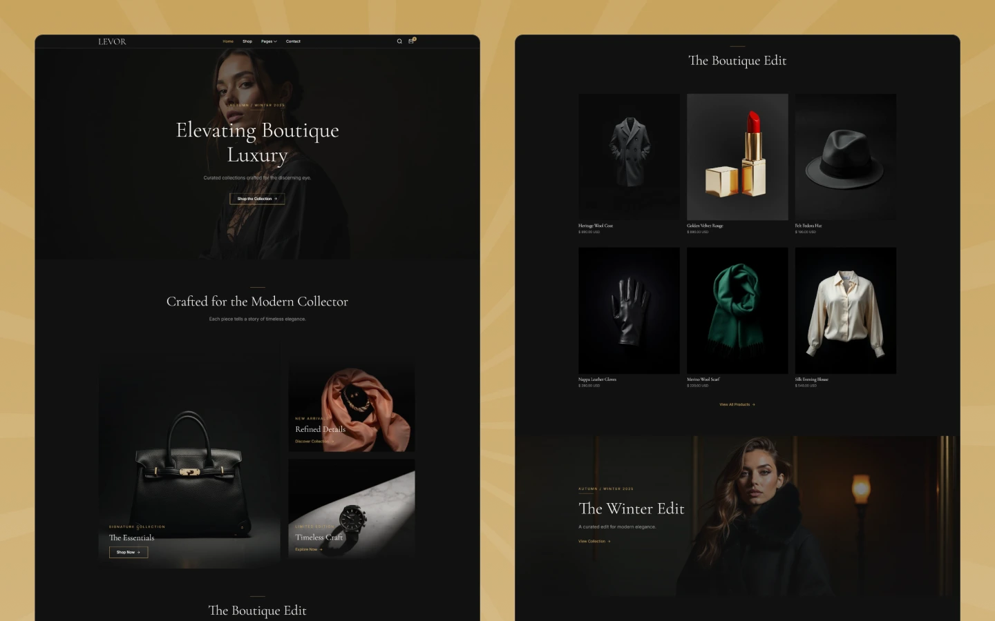 Levor is a stunning Webflow eCommerce website template for online stores. This luxury eCommerce website template helps you sell products with style. It is perfect for any fashion eCommerce Webflow template needs.