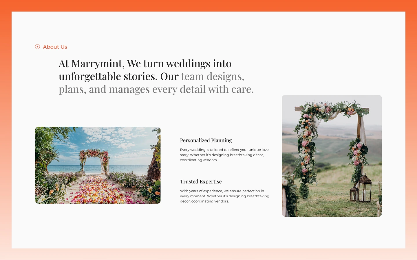 Unlike generic business themes, Marrymint is built from the ground up as a focused wedding template and event template. Every section is shaped around how real planners and venues tell their story, present services, and guide couples through the planning journey. You can quickly create a professional wedding website template that feels custom, loads fast, and is easy to manage in Webflow.