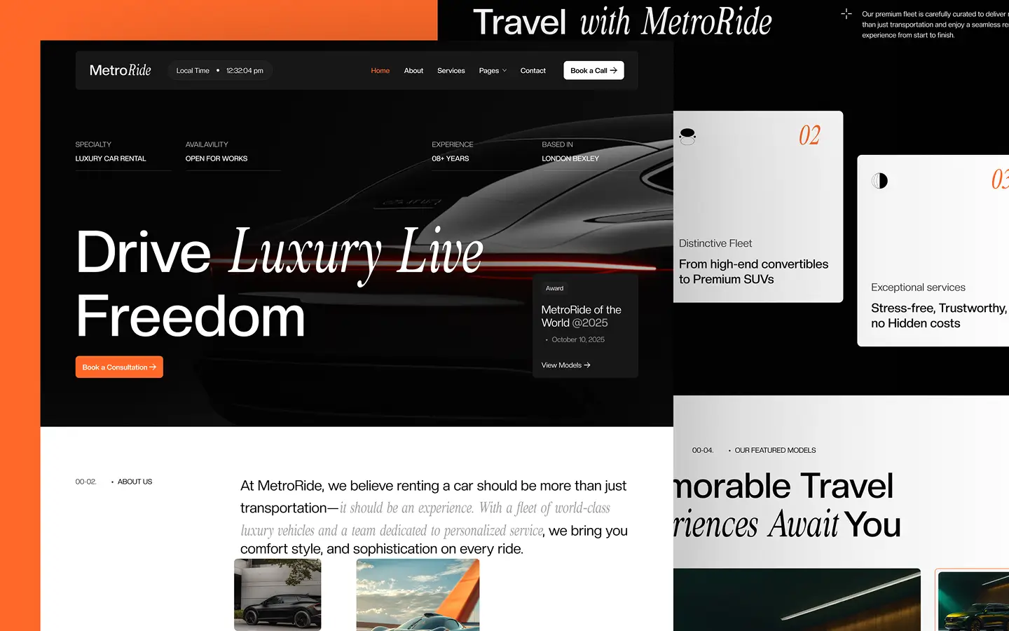 Metroride is a modern, sleek Webflow template crafted for car rental businesses, luxury car hire services, and taxi or ride-booking platforms. It features user-friendly layouts and essential tools for showcasing vehicles, and managing bookings.