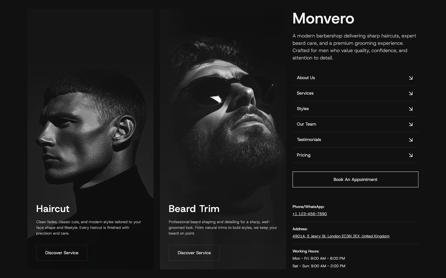 With a strong visual hierarchy and balanced layout, Monvero helps businesses communicate professionalism, craftsmanship, and attention to detail while guiding visitors toward booking an appointment.