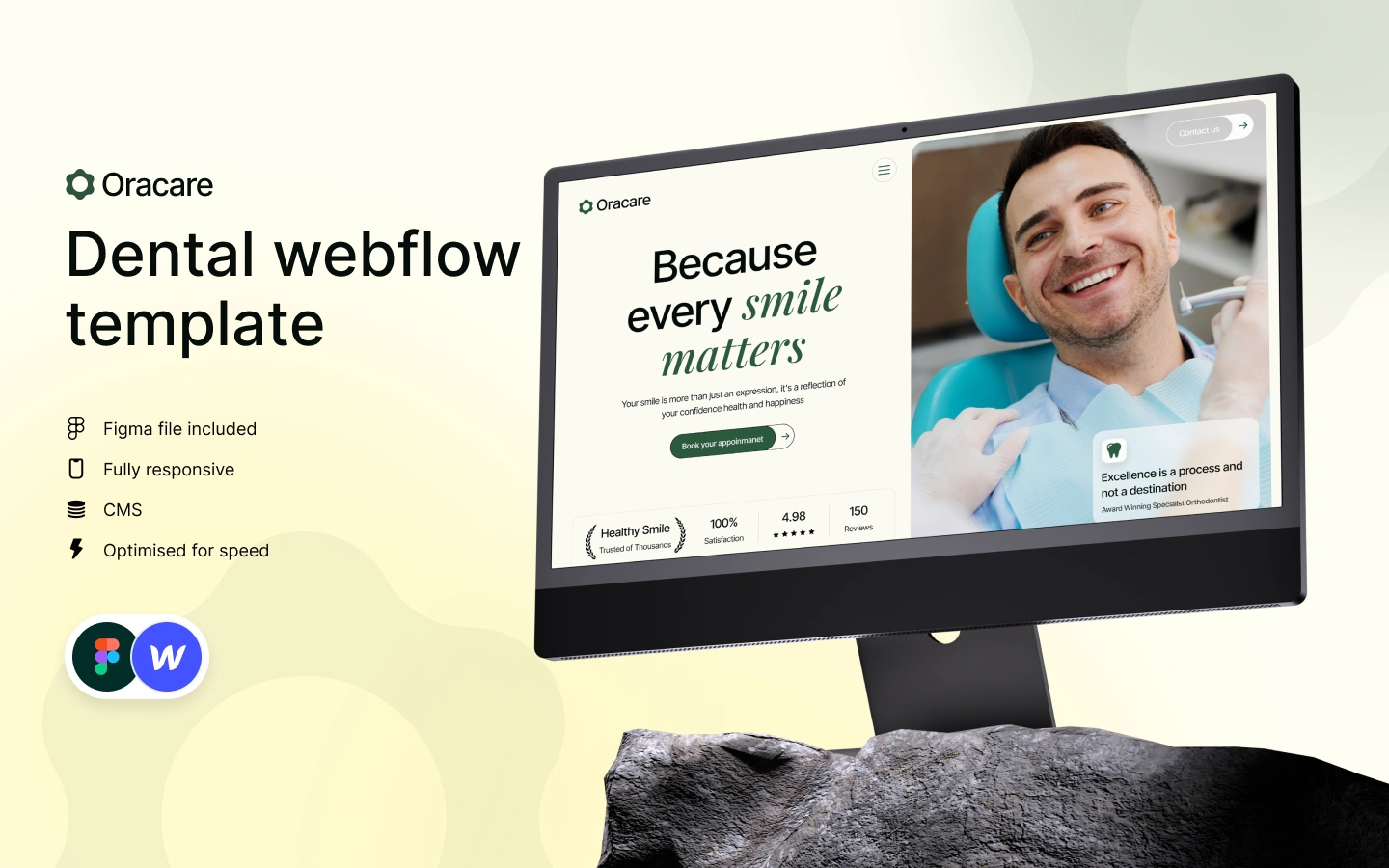 Oracare blends high-quality UI with medical-grade functionality. The template includes everything dental professionals need: treatment pages, doctor profiles, CMS-driven blogs, pricing tables, FAQ sections, and conversion-focused layouts optimized for patient bookings. It’s designed to help clinics stand out online, especially in competitive searches like dentist website design, website design dentist, and webflow template medical niches.