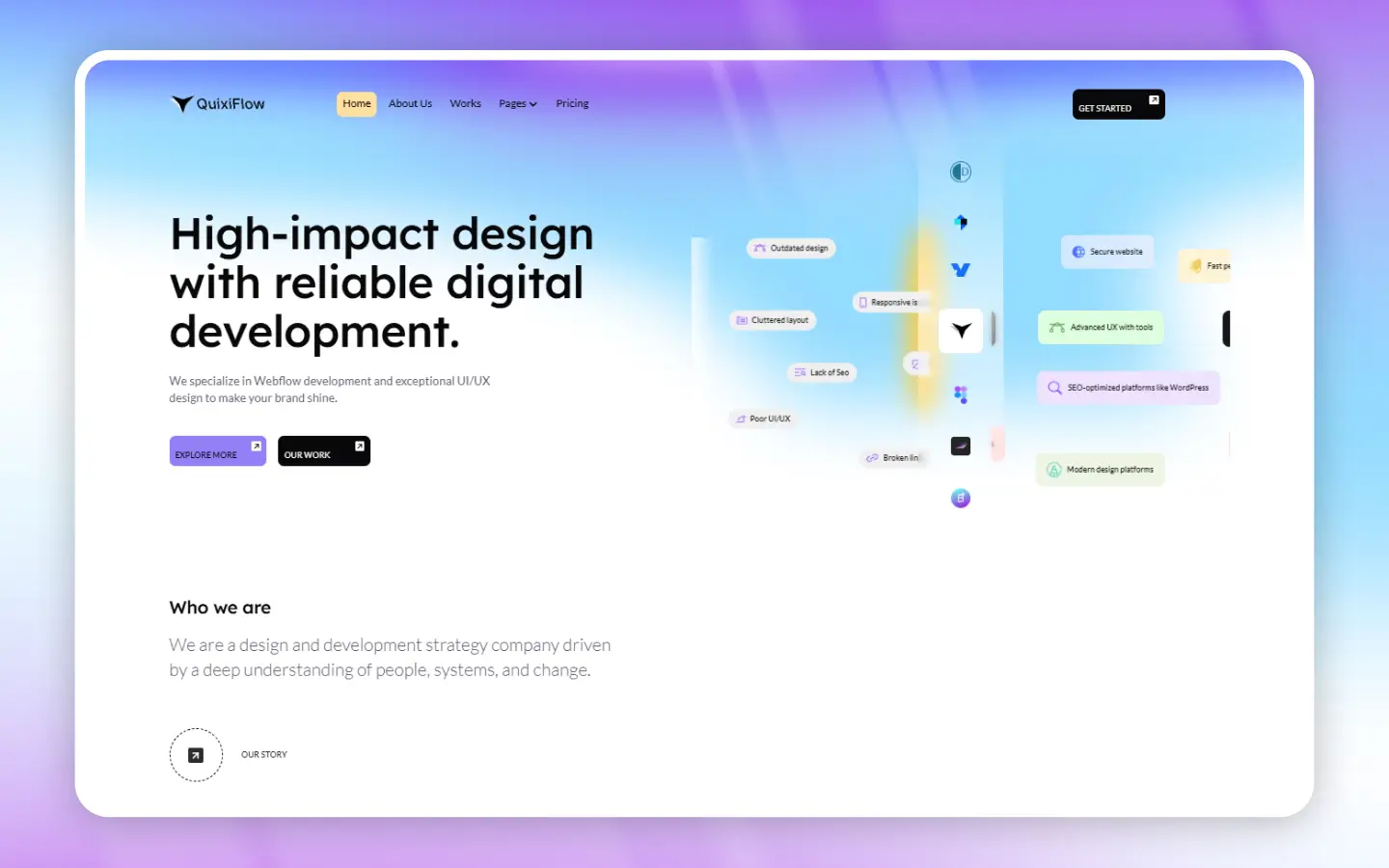 QuixiFlow is a perfect design & development agency Webflow template. It suits web design, web development, digital marketing, startups, technology, IT solutions, UI/UX Design, freelancers, SEO, consulting, branding, and developer websites.