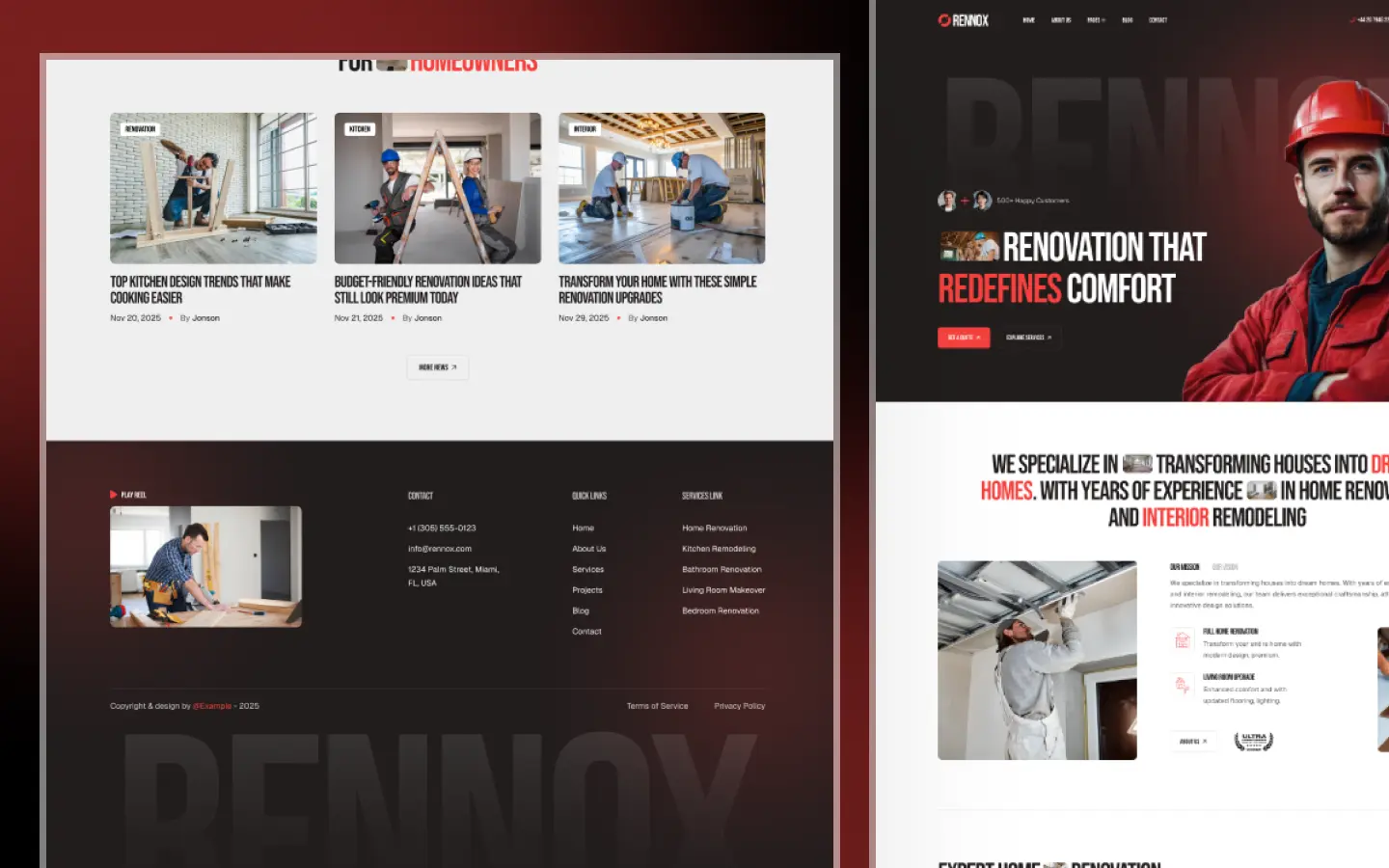 From showcasing detailed before-and-after projects to outlining renovation solutions for kitchens, bathrooms, interiors, and outdoor spaces, Rennox offers a structured layout that tells your story with confidence. Its smooth navigation, refined visual style, and strong content hierarchy ensure users can explore your services with ease on any device.