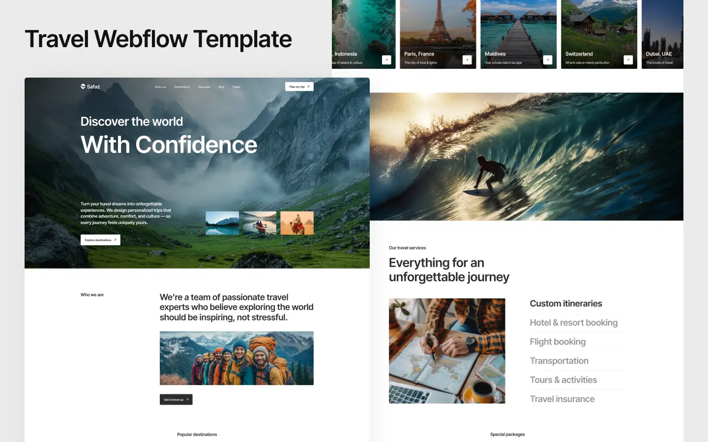 Safaz is a modern Webflow travel template designed for tour agencies, travel bloggers, and adventure brands. It features clean layouts, stunning visuals, and ready-made pages to showcase destinations, tours, and experiences.