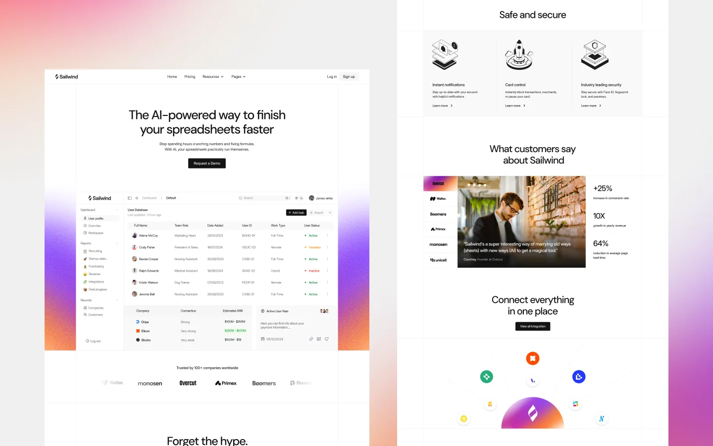 Every aspect of SailwindX is fully customizable, allowing you to adjust colors, layouts, fonts, and content effortlessly. Built on Webflow’s visual editor, you can tailor every page to match your brand’s identity without writing a single line of code. The template’s modular structure makes it easy to expand as your product and company grow.