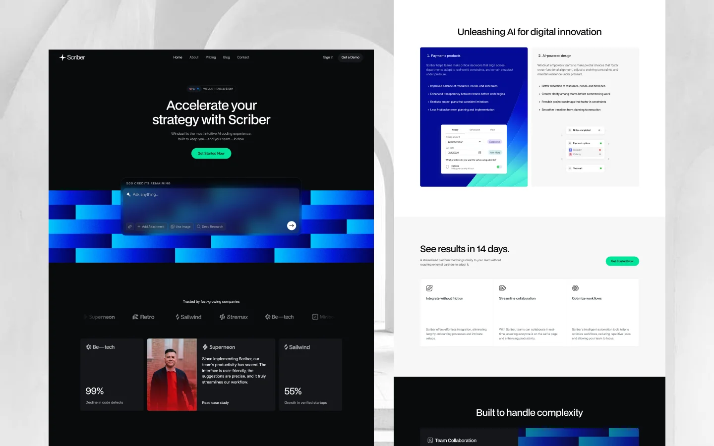 Scriber combines modern dark styling with balanced spacing and strong hierarchy, creating a polished and authoritative look suitable for enterprise brands.