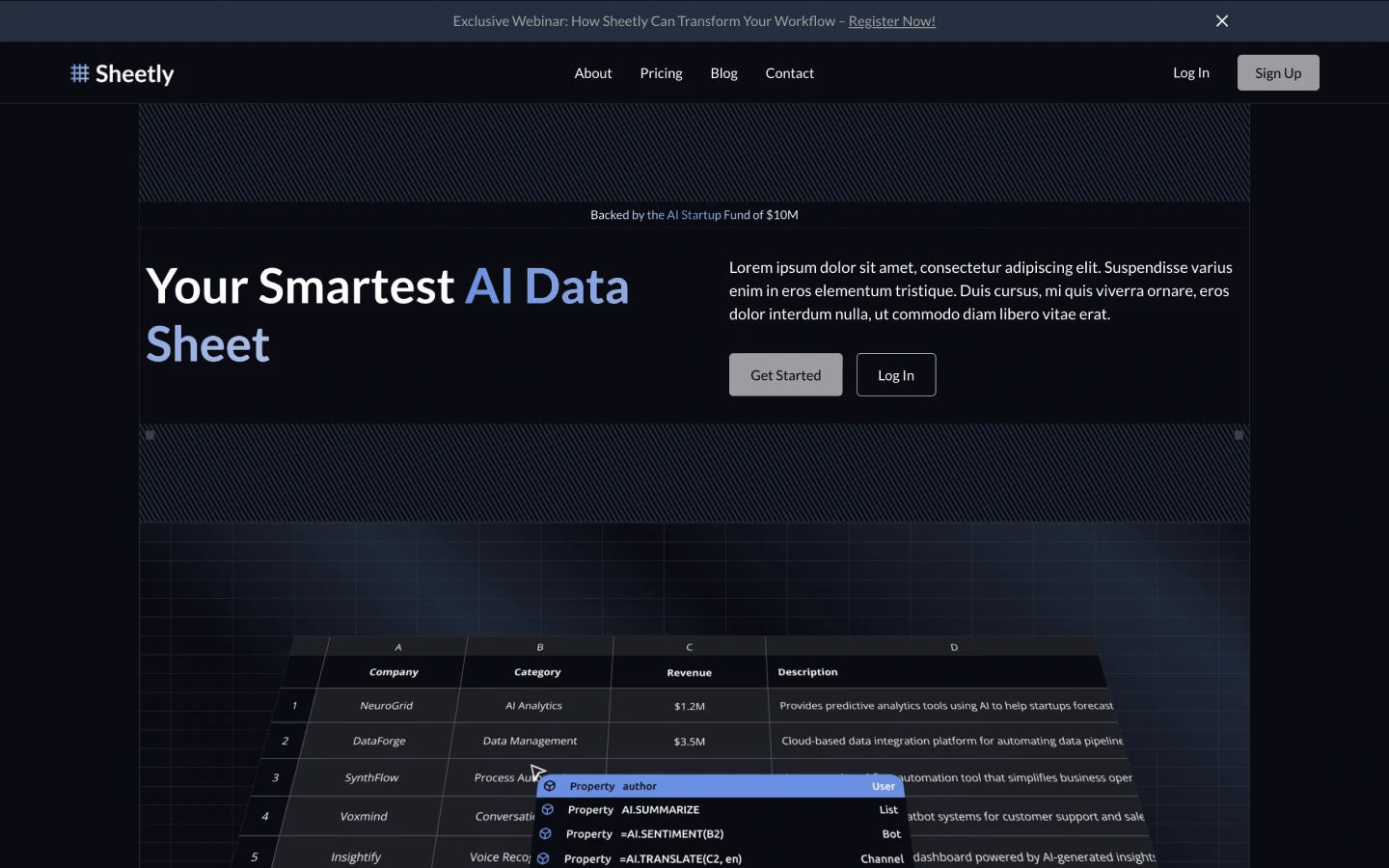 SheetlyBot is a sleek, dark-themed Webflow template crafted for modern tech and AI-driven startups. Its responsive design makes it the perfect foundation for website including AI solutions, Sheet management tools, backend systems, frameworks, automation platforms, testing software, and data analysis services.