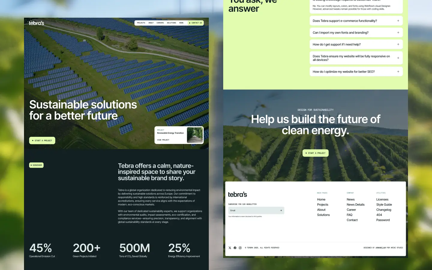 Tebra is a modern Webflow template crafted for sustainability-focused brands, environmental startups, and eco-driven businesses that want to tell powerful impact stories. Designed with clean layouts, smooth interactions, and purpose-led structure, Tebra helps you present climate innovation, green technology, ecosystem restoration, and community initiatives with clarity and credibility.