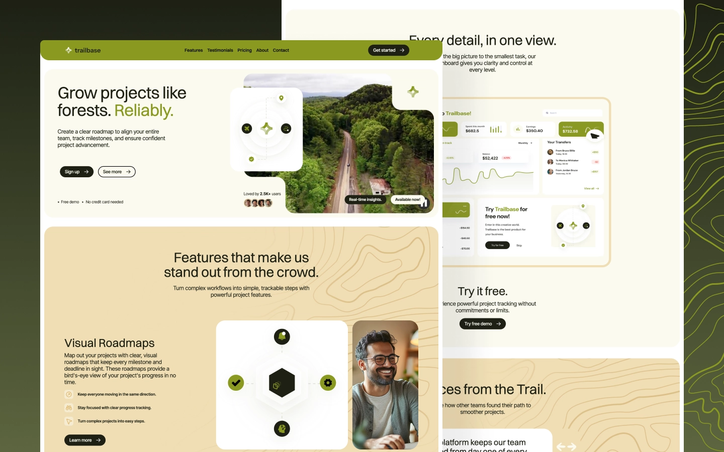 Trailbase helps startup founders attract and convert users with a clear hero, compelling features, clean product previews, trust-building testimonials, simple pricing, and focused CTAs - everything crafted to guide visitors toward taking action.