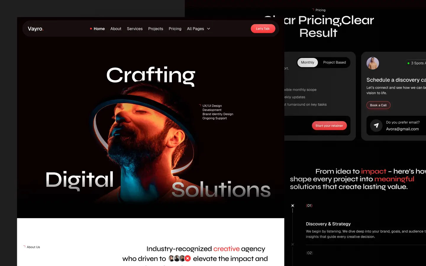 Designed for modern creative teams, branding studios, UI/UX designers, and digital agencies, Vayro combines clean layouts, bold visuals, and conversion-focused sections—helping you highlight projects, case studies, services, and client success stories in a compelling and professional way.