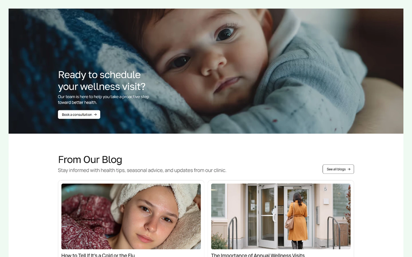 With a flexible CMS, ready-to-use pages, and a clean design system, Wellspring makes it simple to share health tips, highlight your services, and connect with your community.