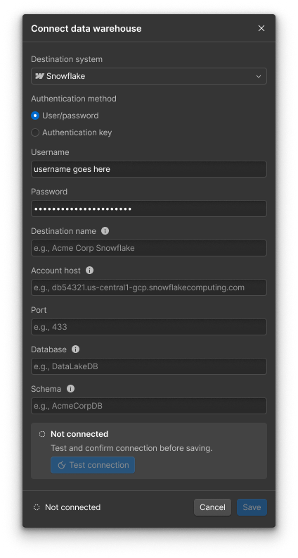 Supported destinations include Snowflake, Google BigQuery, Databricks, Google Cloud Storage, and many more. Check out our help center article for the full list of destinations.