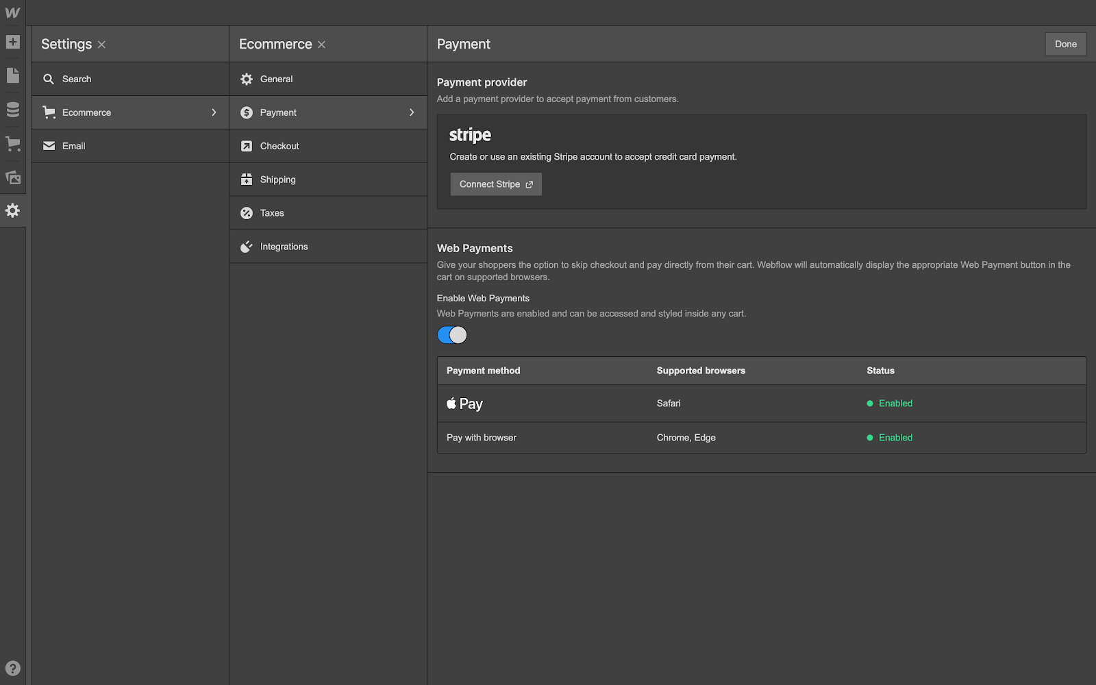 For starters, to enable Web Payments, you’ll first need to add an ecommerce site plan to your project, connect your Stripe account, and enable checkout.