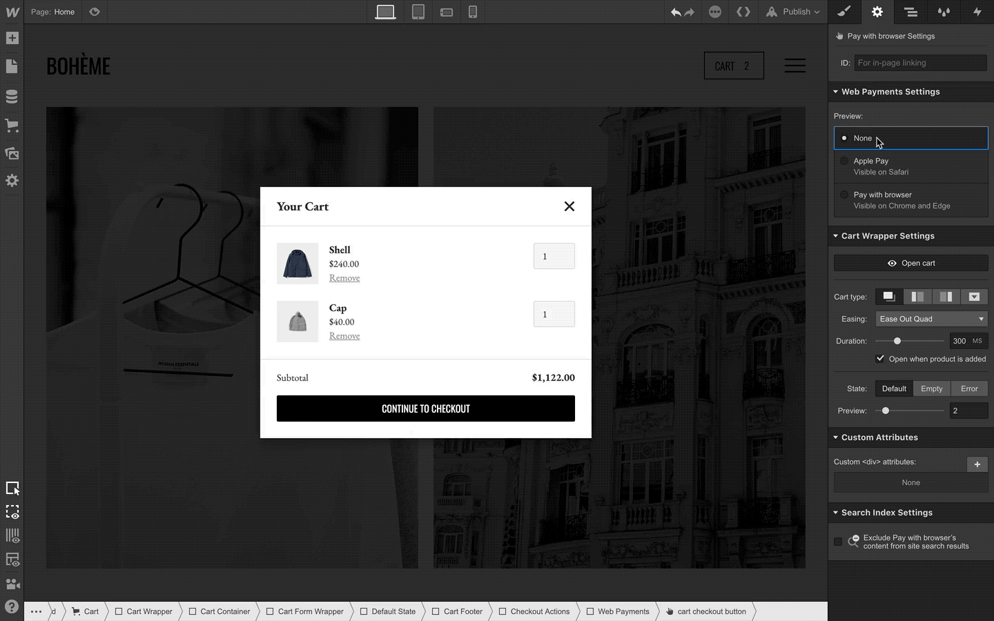 Now you can enable Web Payments as a payment method to let customers checkout faster with Apple Pay and other browser based payment methods, right from the shopping cart.
