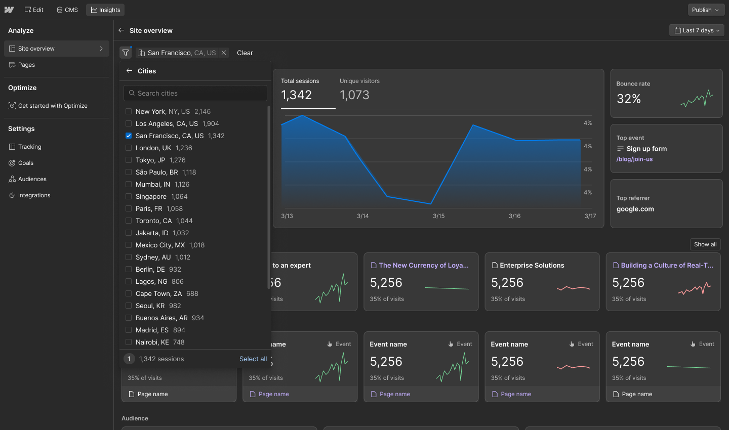 Explore how audiences interact with your site in Webflow Analyze. Filter and save audiences to uncover insights and optimize experiences.