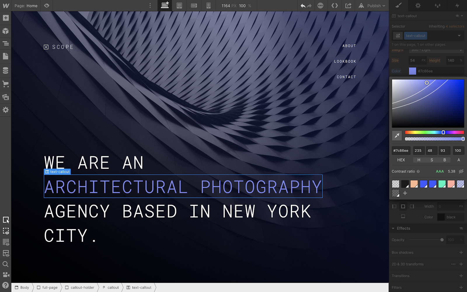 With today’s update, now you can check the contrast ratio of text on your site directly from the color picker in Webflow, which displays not only the contrast ratio of text but also the Web Content Accessibility Guidelines (WCAG) level rating that corresponds to that contrast ratio.