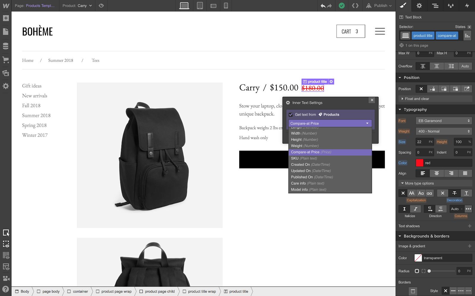 Let’s say you want to show the compare-at price on your product page, styled in a different color and struck through to indicate the price has been … how do you say, “slashed?” Again, pretty straightforward: add a new text element to the page and connect it to the compare-at price field. Then, style that element however you’d like.