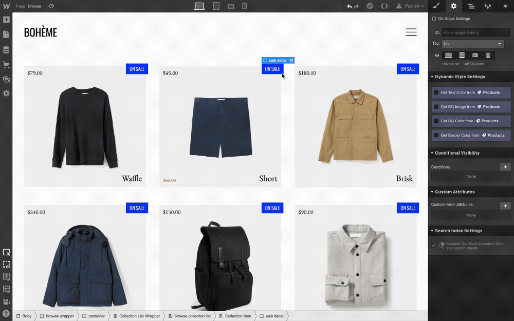 Often, you’ll want to add a small banner or callout on your browsing pages to point out products on sale. With this new compare-at price field and some help from conditional visibility, you can do this pretty easily. Simply create the callout element you have in mind, then set it to only display if the product in question has a compare-at price set.
