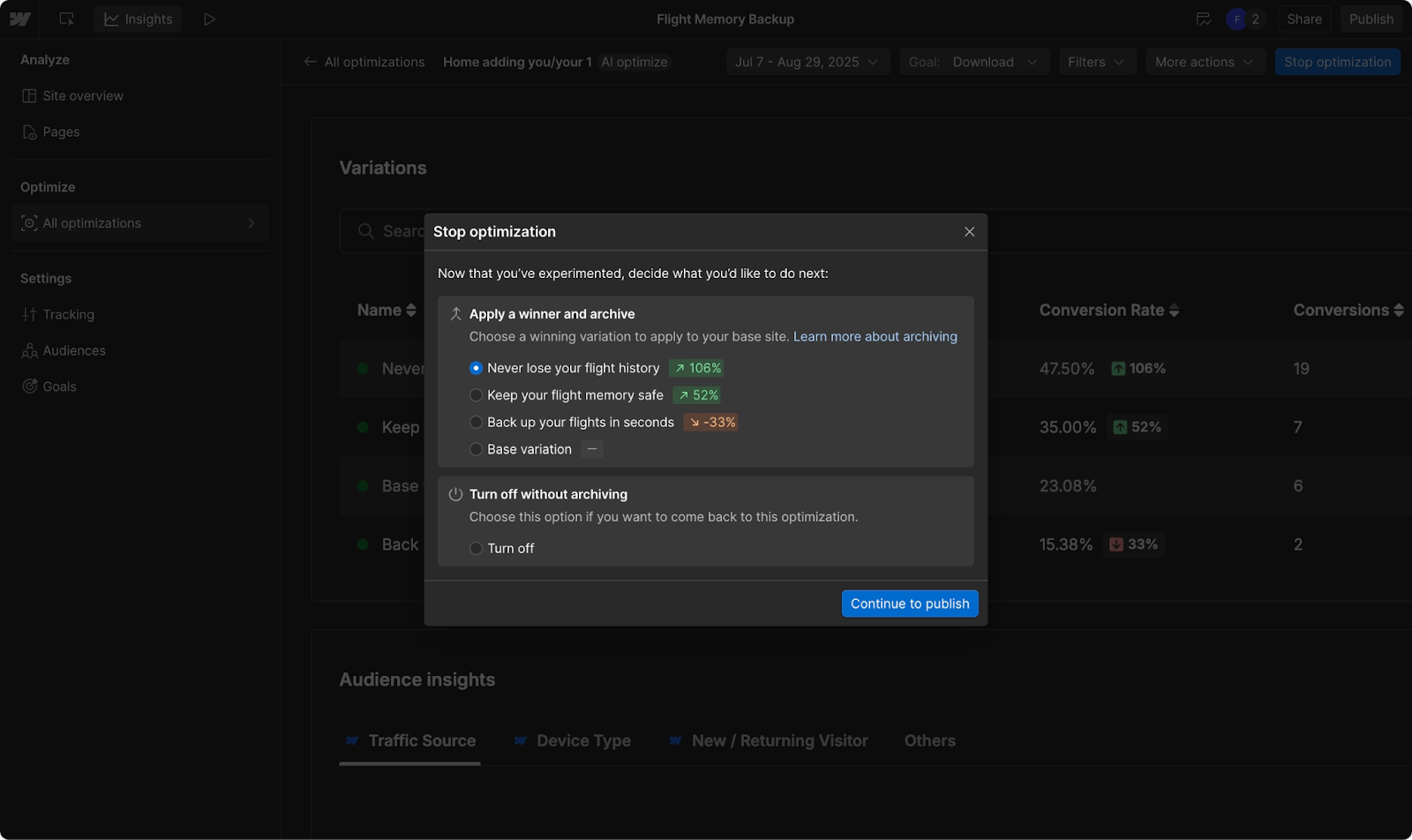 Optimize users with Webflow sites can now apply a winning variation across the whole site in just a few clicks — no rebuilds or extra work required.