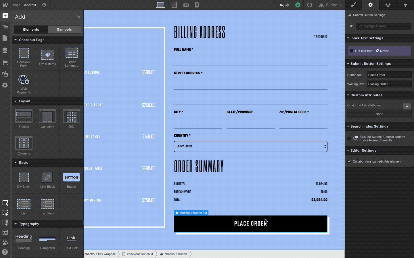 If you’ve got an existing checkout page that you want to enable Web Payments for, simply drag the web payments element into your checkout form and republish (make sure you have web payments enabled in the first place, under your ecommerce payment settings).
