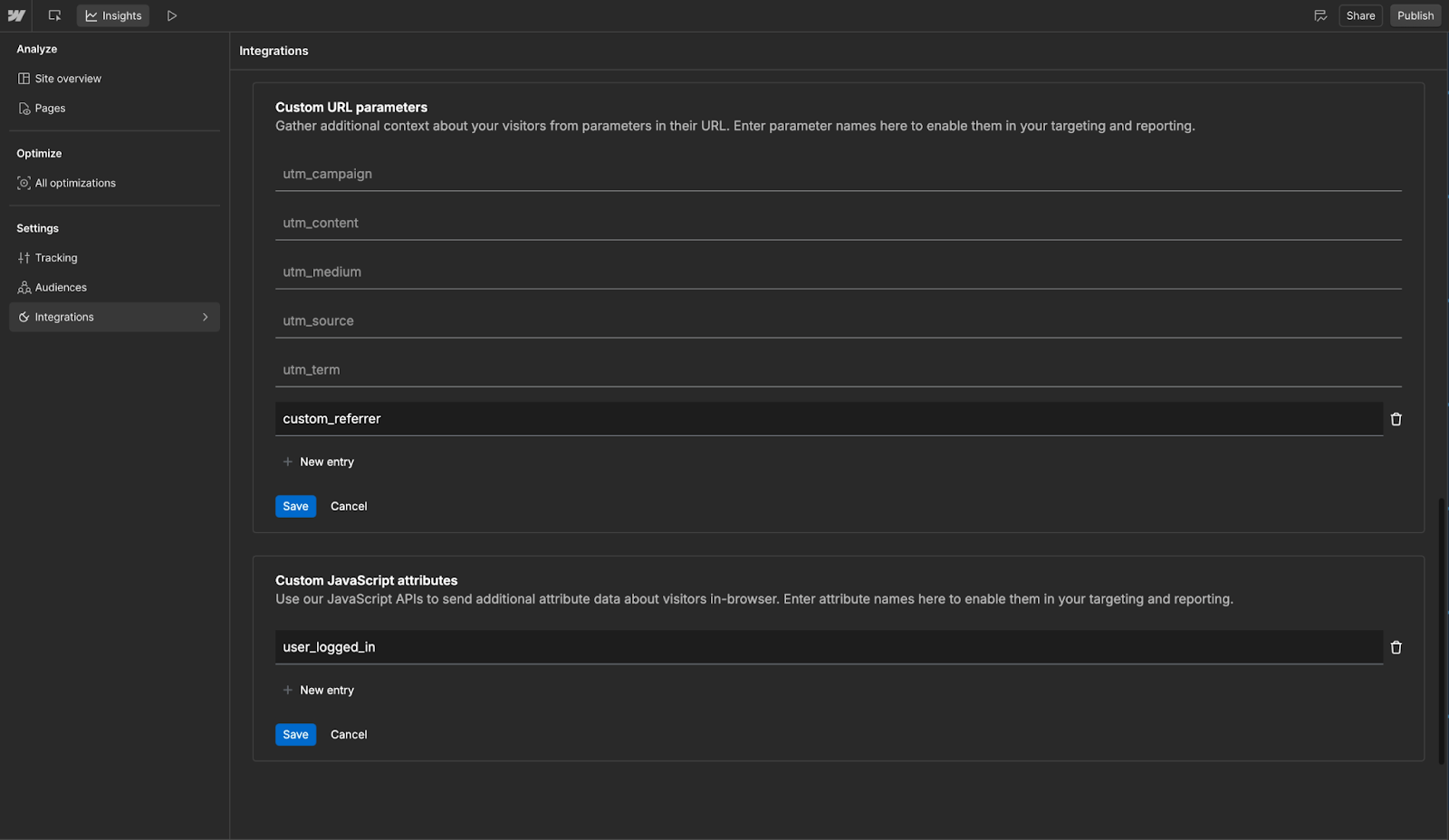 Next up are two new features that give you the ability to bring even more data to target and report on optimizations. You can now use a Webflow API to set custom attributes (characteristics associated with your visitors) that leverage additional data you’ve learned, collected, or acquired. In Optimize, you can then add those custom attributes as optimization results filters or as optimization audiences to target visitors.