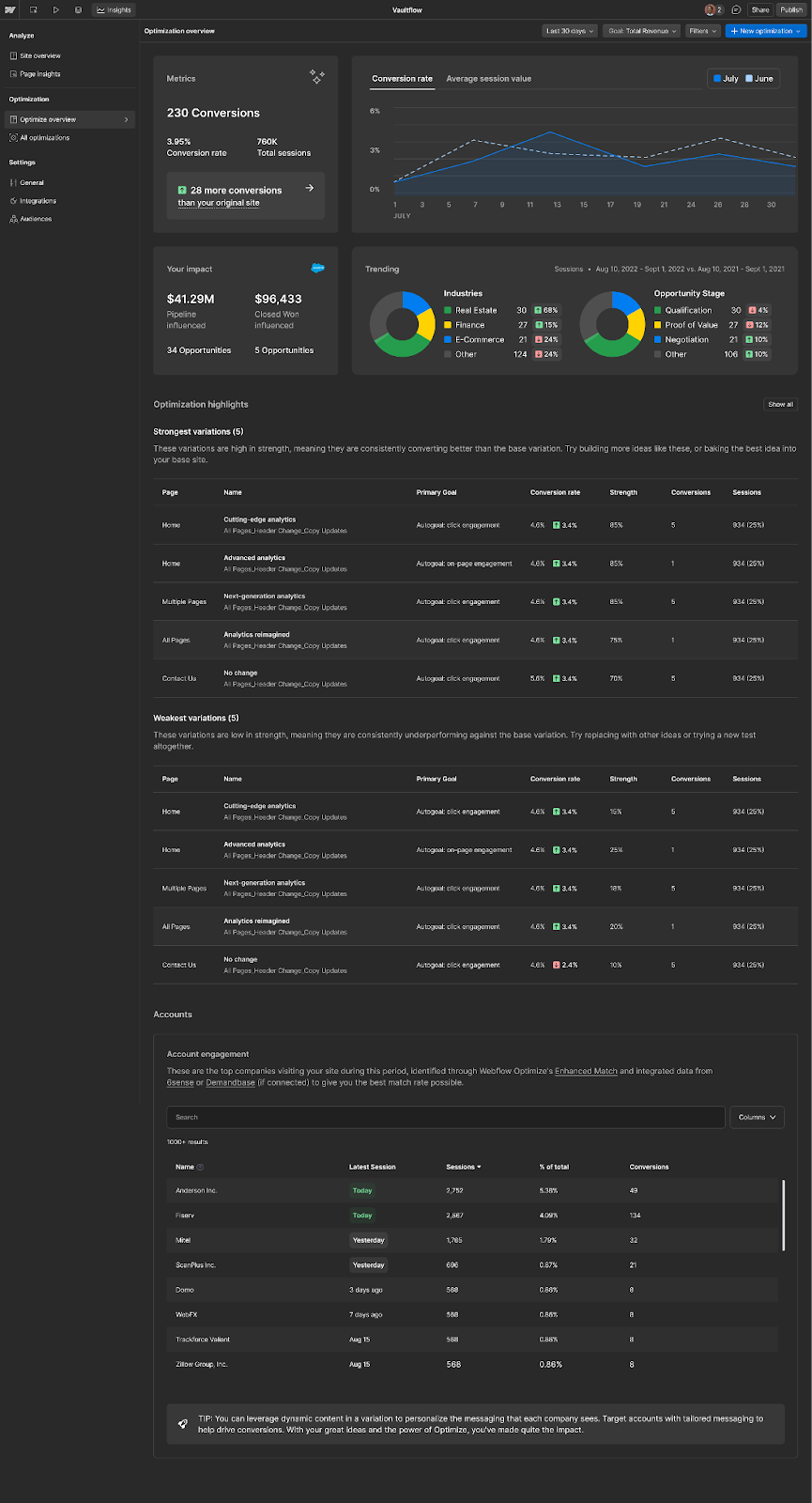 The Optimize overview page gives you a high-level view of the overall impact your optimization efforts are having across your website. On this page, valuable insights into visitor engagement are front and center; see which companies are visiting your site, evaluate the performance of your variations, and even compare different optimization scenarios with the ROI simulator.
