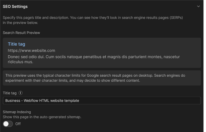 Turning this on for a given page ensures that search engines will skip the page when crawling it and that the page will be removed from the automatically generated sitemap file that Webflow creates for your website — ensuring your site is tuned exactly how you want it for Google and other search engines.