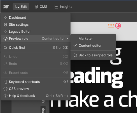If you have a Designer or Site manager role, when you enter via this shortcut, you will preview the canvas as a Content editor by default. You can switch back to your assigned role by navigating to the hamburger menu and clicking Back to assigned role.
