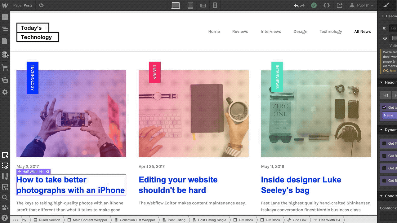 - Jump to the specific element in the Designer that’s connected to a CMS item