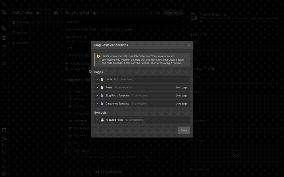 Earlier this year we announced a new connections manager that lets you see everywhere a collection is connected to your designs. Today we’re sharing some exciting improvements that make it even easier to find, view, and/or delete your CMS connections.