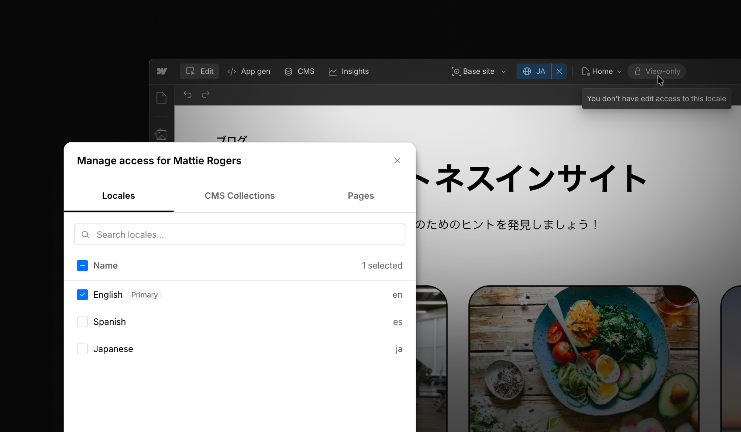 By default, when a user has access to a site, they can edit content across all locales. But for global teams, you may want to scope editing access to specific locales only — for example, to keep regional teams working in their own language, or to give external translators access without touching the primary locale (learn more). For example: