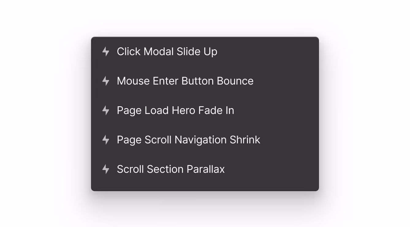 In addition to simpler preset animations, Webflow Interactions enables you to create your own custom animations. Like other parts of a design system, these should be named with care for discoverability and reusability.