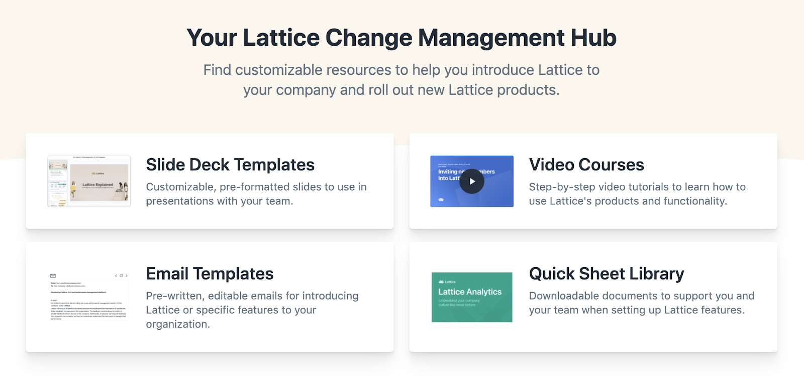 We came up with this idea to create a Change Management Hub that would provide a series of custom decks, intro emails and custom collateral that would help with the Lattice implementation.