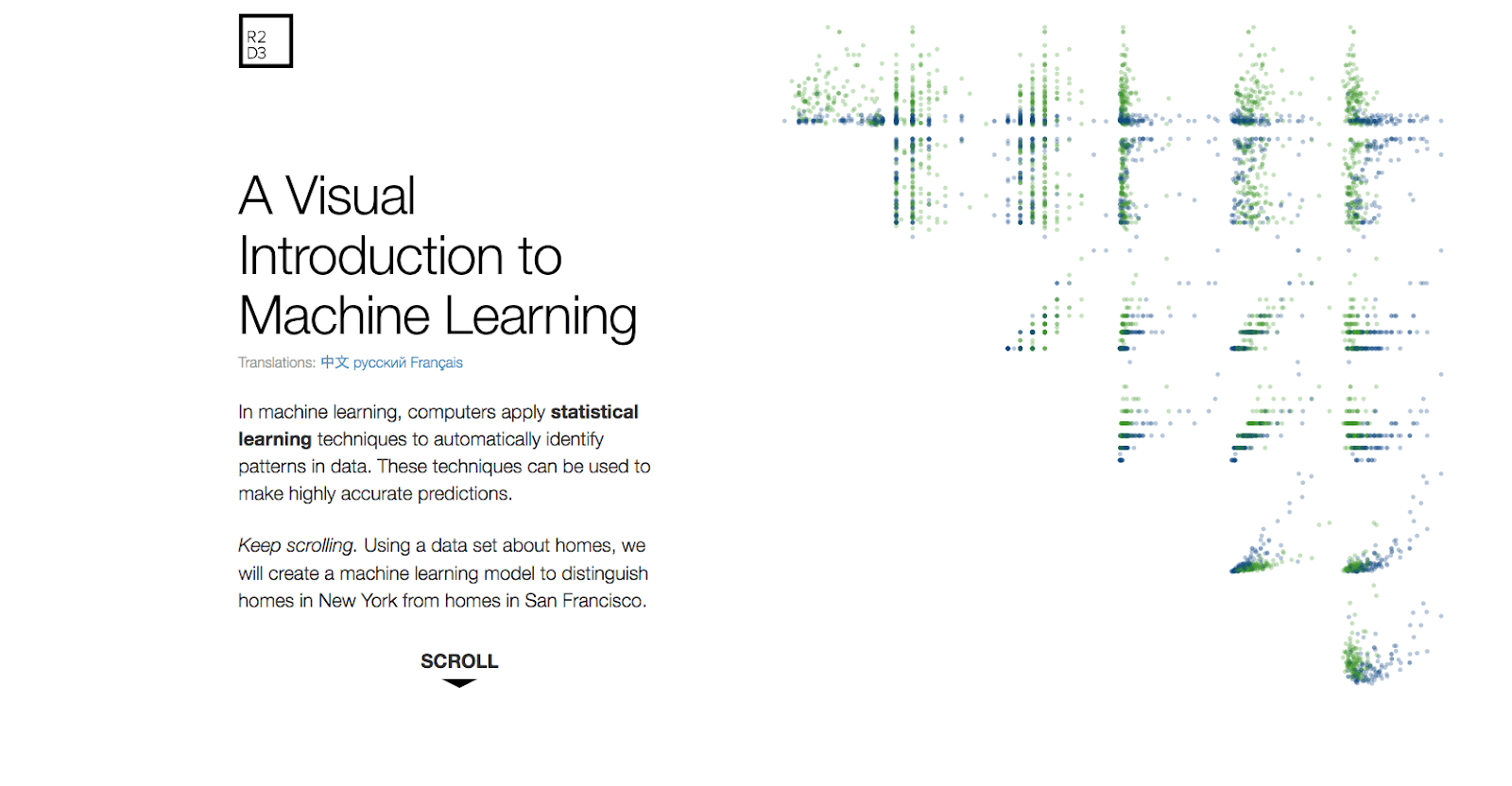 R2D3 uses the power of scrollytelling to explain machine learning in an approachable way. To teach this lesson, they built color-coded data sets measuring different attributes of homes in San Francisco and New York. Then, they created animations to show how AI uses statistics to find patterns and group similar pieces of information together.